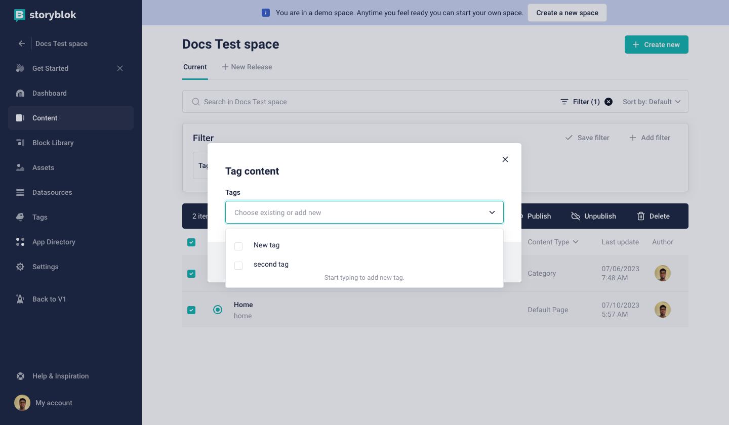 From the main Storyblok menu, click Tags {1}. You’ll then be able to see all the tags you’ve used in your space.