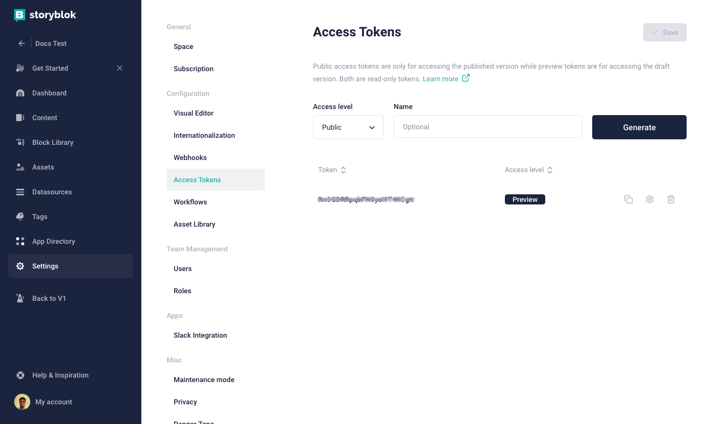 Storyblok access tokens allow you to programmatically connect a space to your frontend framework. You can learn to retrieve and generate access tokens in your Storyblok space in the steps below.