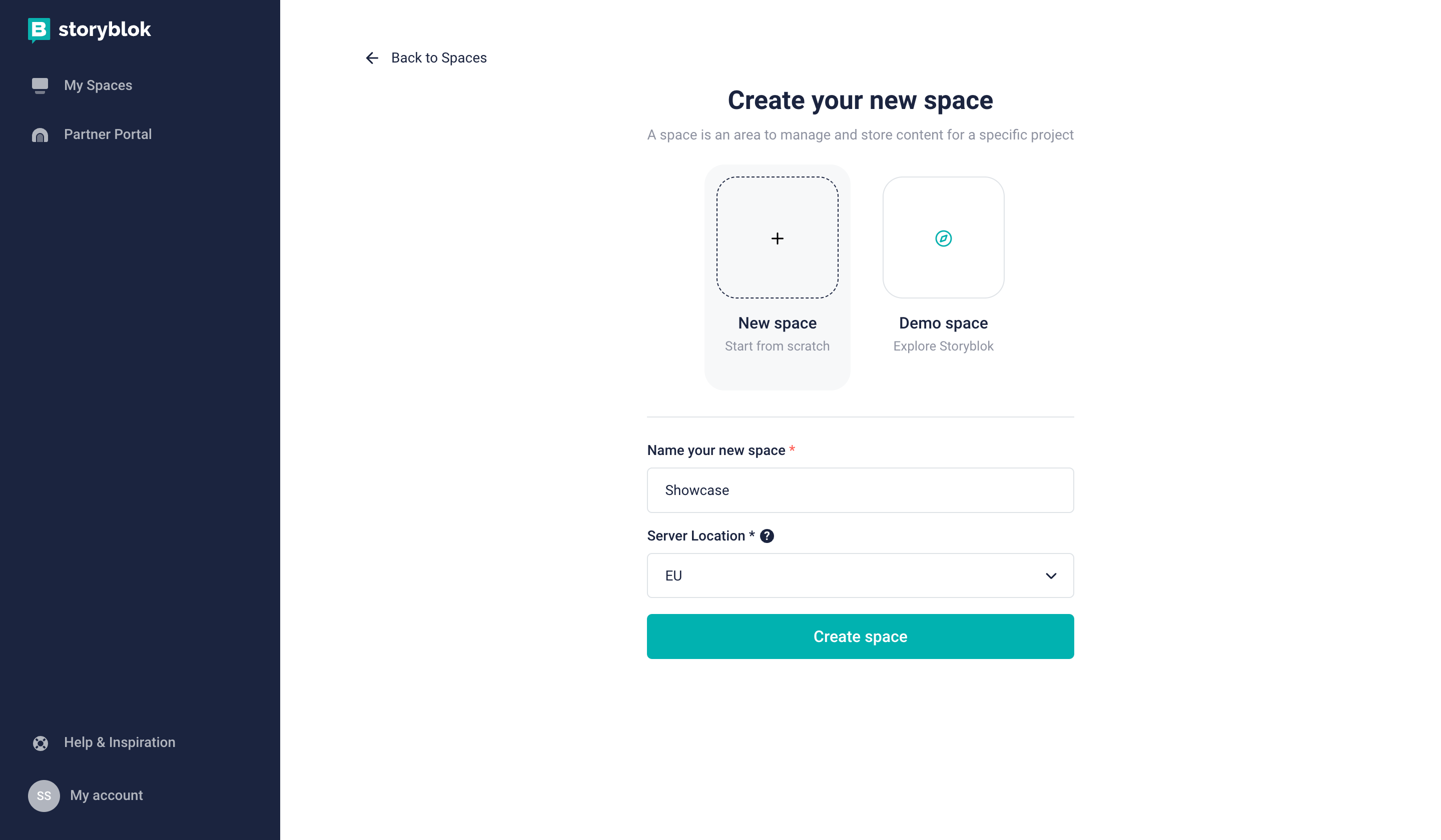 To set up a Storyblok space, log in to your account or create a new one, and click on New Space {1}.